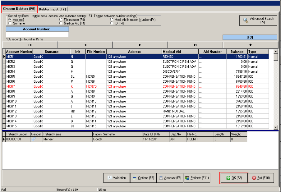 - The Debtors List (Admittance Screen) is displayed. Use this screen to confirm important Patient details such as: