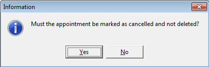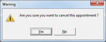 Click Yes to confirm cancellation (Appointment will be removed/deleted from the Diary).