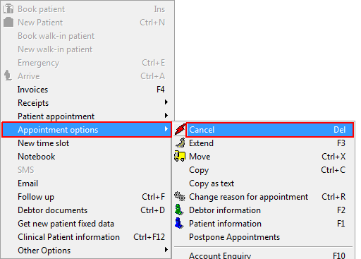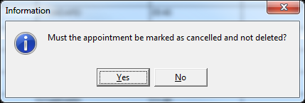 If the patient does not show up for the appointment, you have the option to totally delete the appointment, or you can mark it only as cancelled so that you can draw no-show reports.