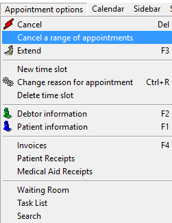 A range of appointments can be canceled if the doctor will not be able to be in his rooms, for example, urgent operation in theatre, etc.