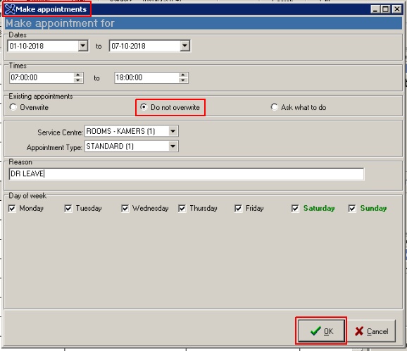 NOTE: Make sure that the Existing Appointments tick is always on DO NOT OVERWRITE.
