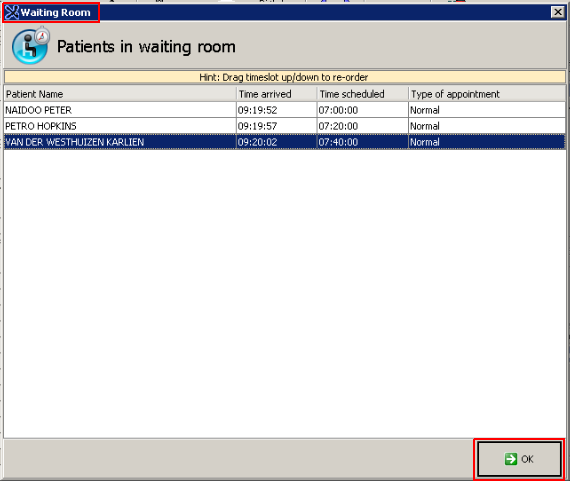 The waiting room list will by default be in the order of appointment time, but if you want to change the order you can drag the appointment up or down to change the appointment order.