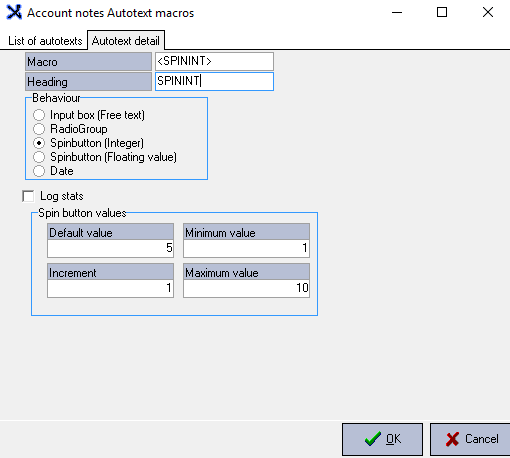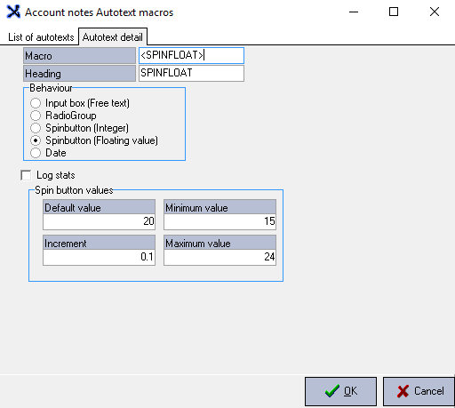- Spin Button Values: Number with a decimal value ex. 0.1