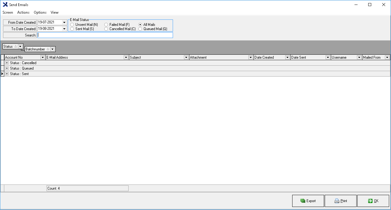 - Count: The total amount of E-mails that are being displayed on the screen. This will be determined by the search filters that have been applied.
