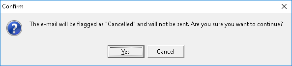 - A Confirm pop-up will appear to ask the user whether they want to flag the email as "Cancelled" and not send the E-mail.