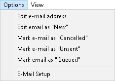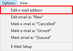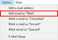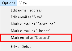- Click on Options on the menubar then Click on Mark an E-mail as "Queued" on the sub-menu. This will allow the user to queue the E-mail to be resent. Only failed E-mails can be queued.