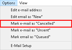 - Click on Options on the menubar then Click on Mark E-mail as "Cancelled" on the sub-menu. This will allow the user to cancel the sending of an E-mail that has not been sent yet.