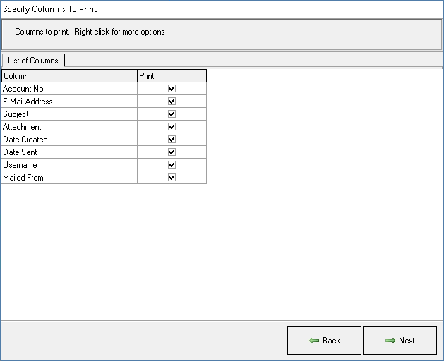 - Make a selection by clicking on the corresponding check box of the columns that the user would like to print.