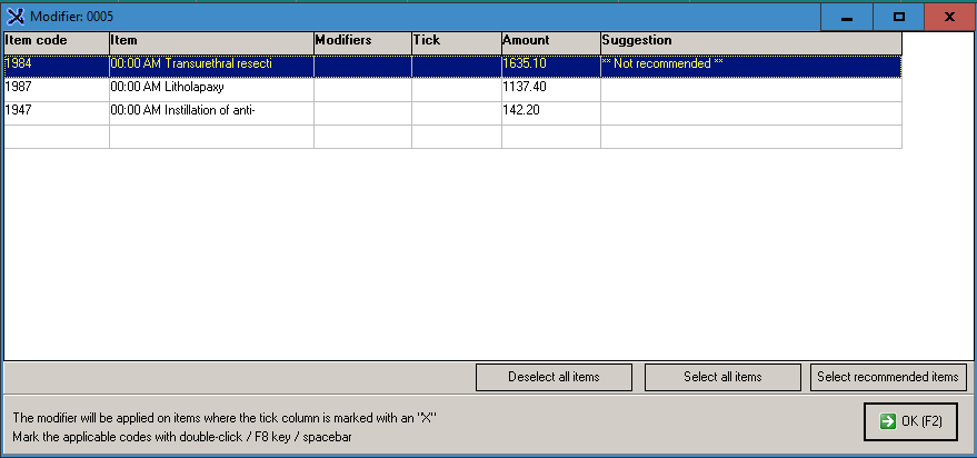 The "suggestion" column is only populated when the system does not recommend that the billing code is modified.  In the example below the system recommends that the "1984" should not be modified when applying modifier 0005.  By implication, the system suggests that the other two codes may be modified.
