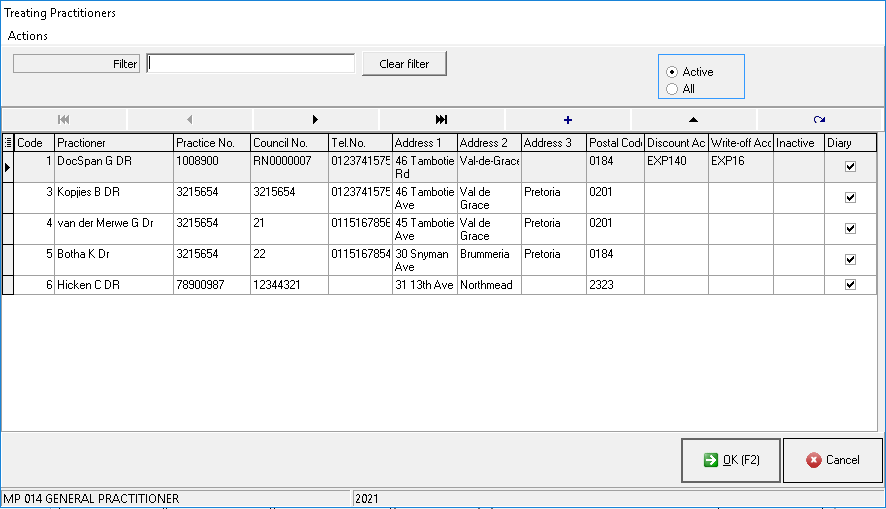 - The Treating Practitioners screen will open with the list of all the practitioners that are registered at the practice.