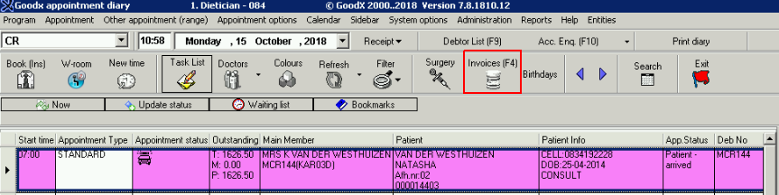 - From the Diary screen, on the shortcut bar click on "Invoices (F4)".