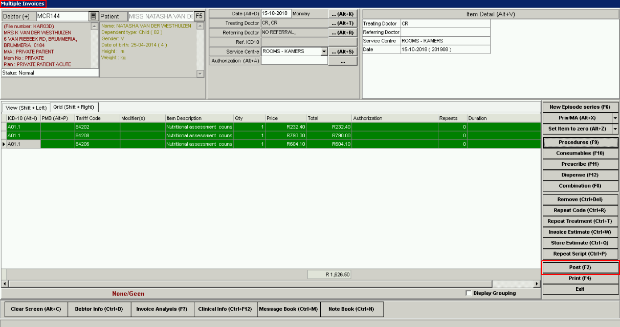 - Bill the Patient by clicking on Procedures (F9) (follow the steps like discussed in MedDebs on how to Bill from the Multiple Invoice screen) >> Medical and Dental Practices >> Medical Debtors Module >> Billing >> Multi Invoice.