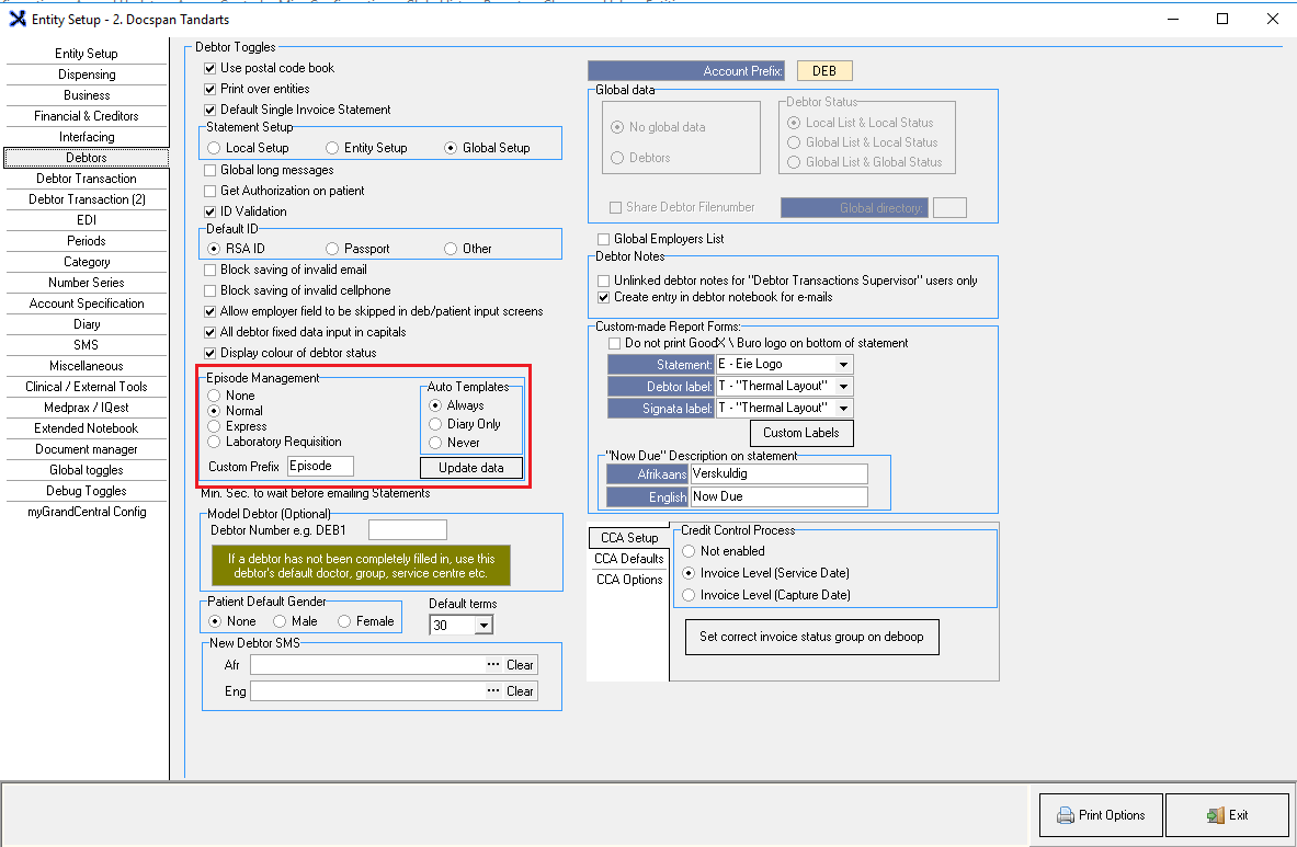 - Under the Debtors tab select Episode Management, tick Normal