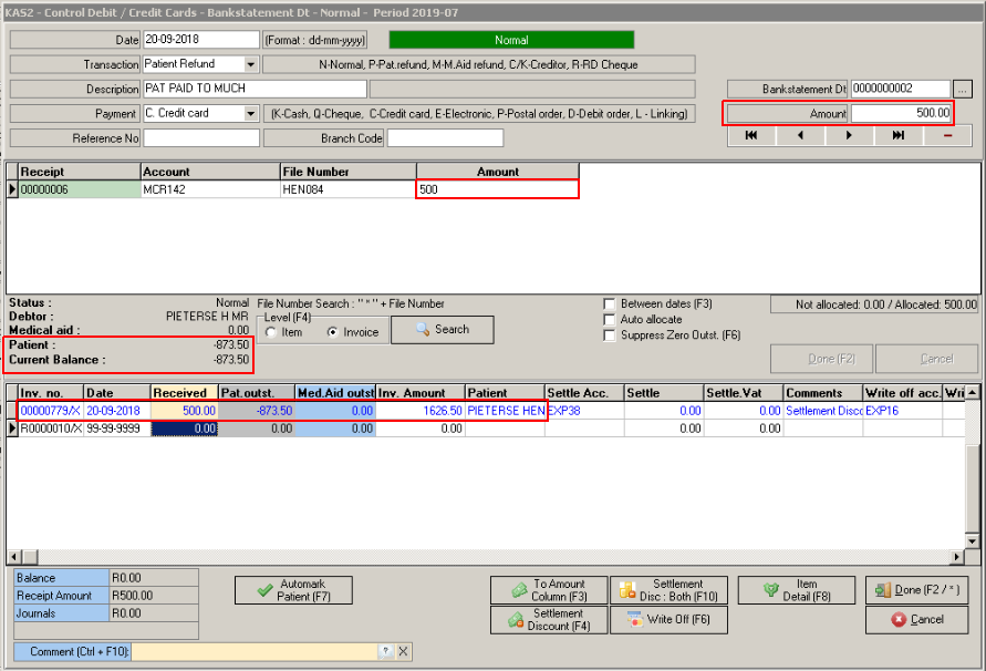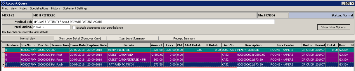 • First Receipt is the Patient Receipt where the Patient made a Payment of R2500. (Patient overpaid the account by R873.50)
