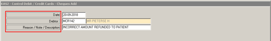 NOTE: If a Patient/Medical Aid overpaid the account, you need to do a refund. You can click on the link Payment to Patient / Medical Aid (Refund) to see how to do a refund. The Payment To Patient / Medical Aid Add is used when an incorrect amount was refunded. See the example below on the refund that was done short: