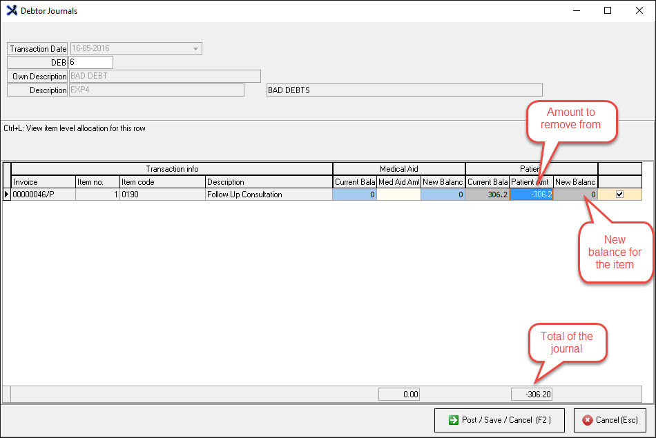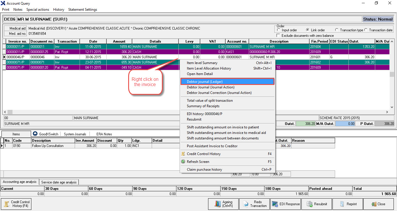 The medical aid and patient invoices will display so be sure to do the journal on the correct side.