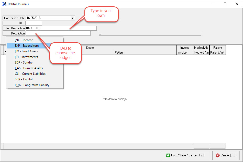 • Settlement Discount. (Example: Give patient R200 discount for settling the account.)