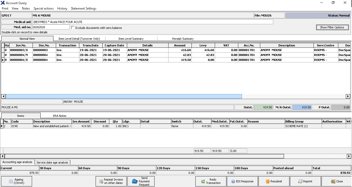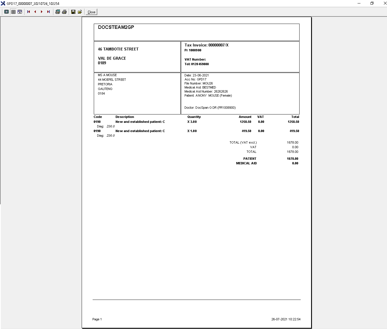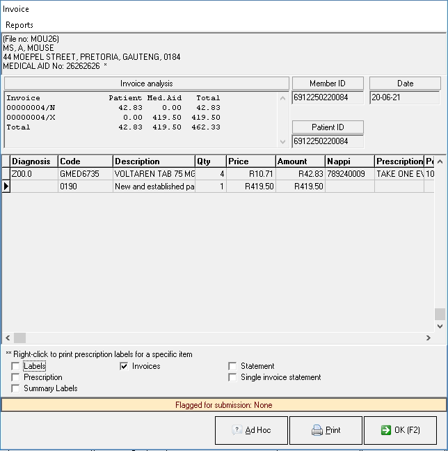 Reprinting an invoice allows a user to print a copy of the original invoice. Invoices are usually reprinted to keep a copy in the patient's hardcopy file as a reference to what was prescribed should the electronic copy not be available, or if a patient has misplaced their copy they will request a copy from the practice.