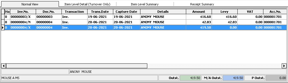 • Click on Ok to close the Invoice screen and return to the Account Query screen.