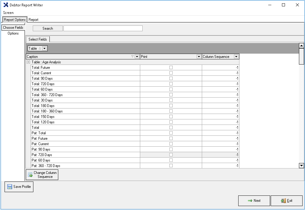 • The user will start on the Debtor Report Writer screen Report Options tab, where the desired columns will be selected in order to generate the report.