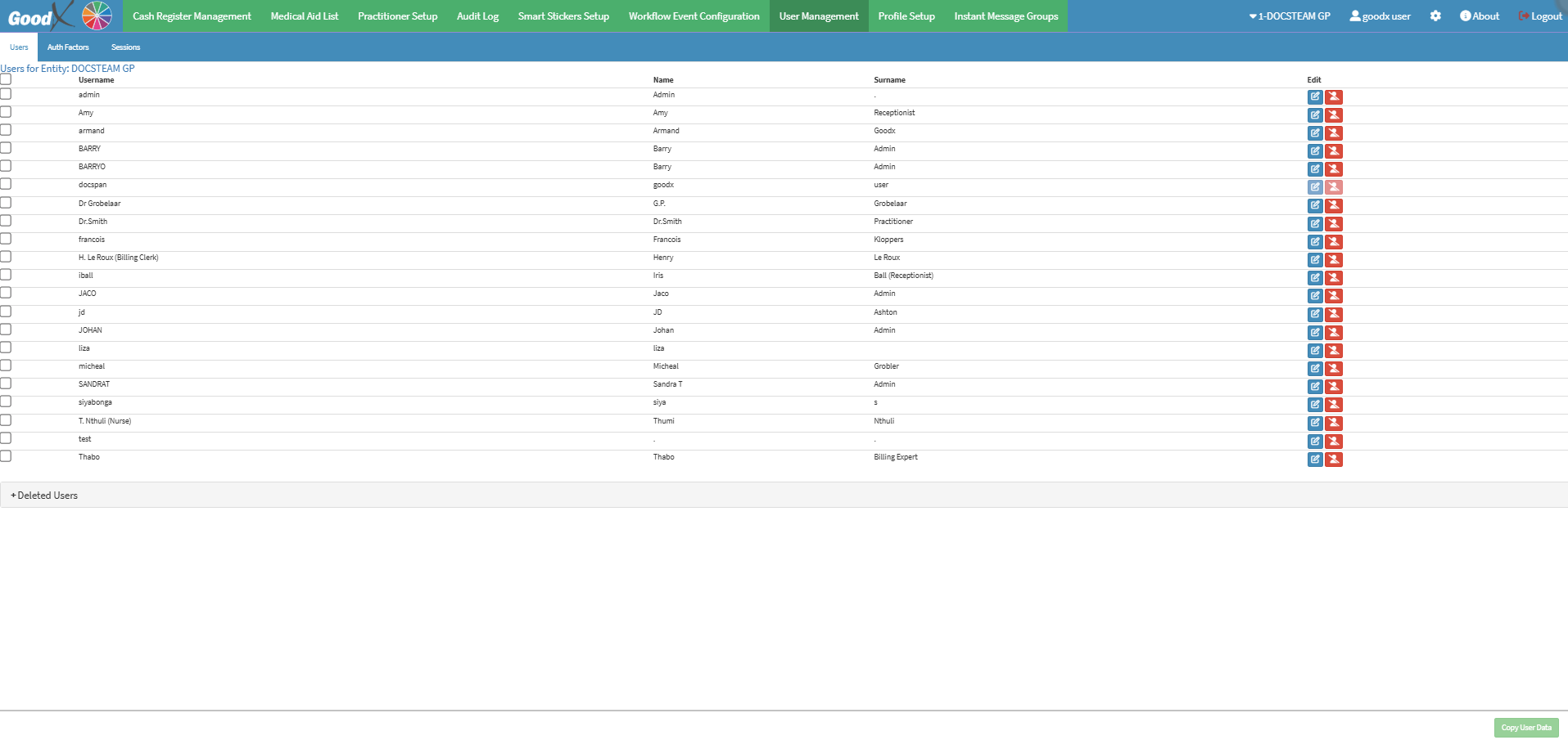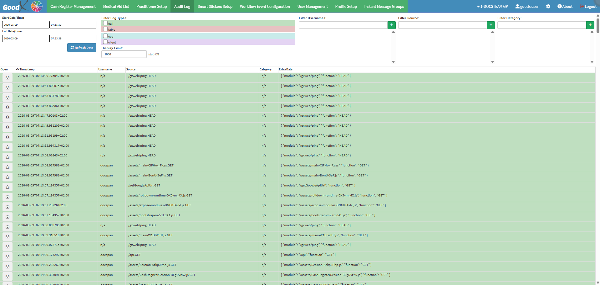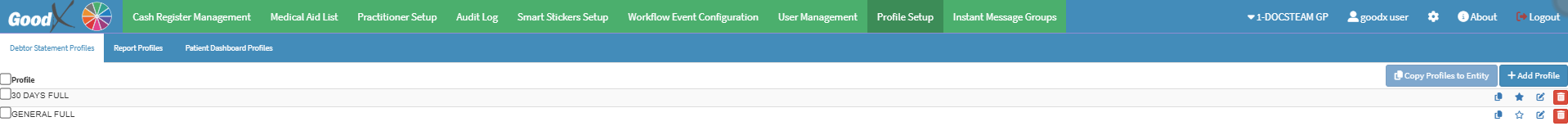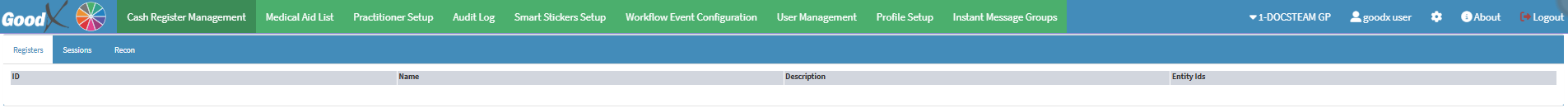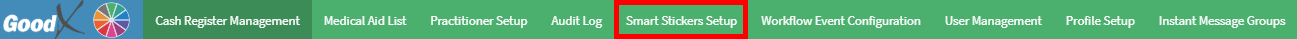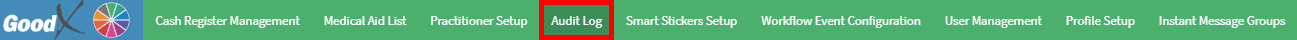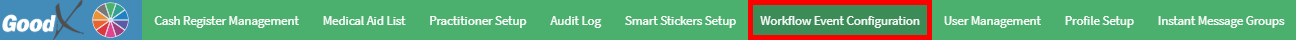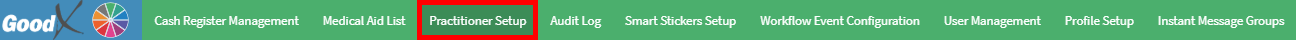 Configuration is the management and set up of certain features within the GoodX Web to allow you to manage the software to the specific needs of the Practice. For example, you will be able to access the Cash Register, Medical Aid List, Practitioner Setup, Audit Log, Smart Sticker Setup, Workflow Event Configuration and the Profile Setup.