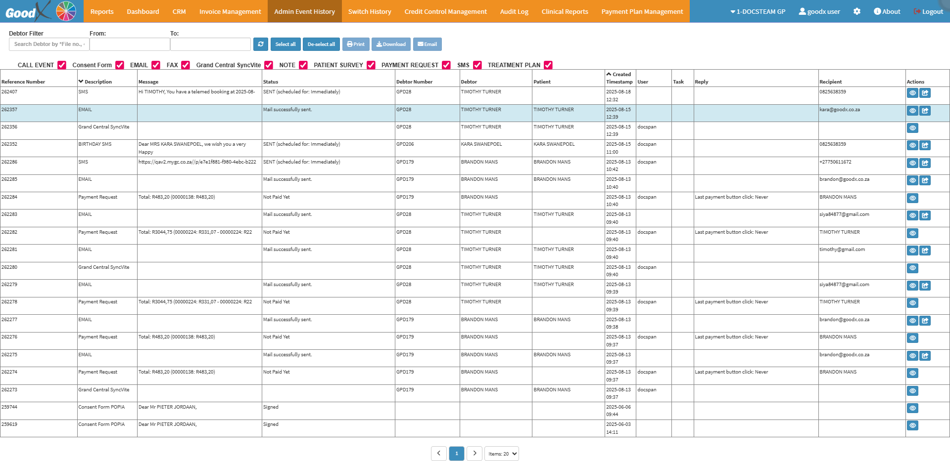 All SMS's and Emails that have been sent can be accessed from the Admin Event History screen. You will be able to view all communication that has been sent to a Debtor or Patient, like Booking Reminders, Payment Requests, Patient Surveys, Clinical Documents, etc. You will be able to see if the communication that was sent went through successfully and resend already sent communications.