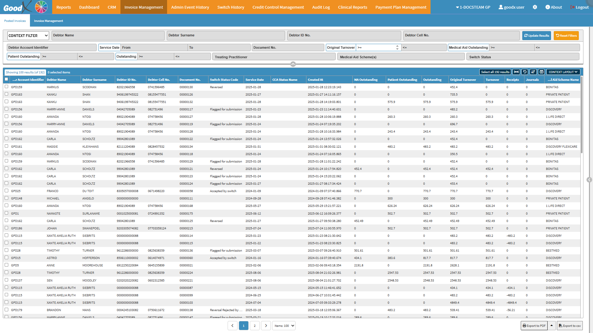 All the information about when the claim of the Patient's visit was Switched and sent to the Medical Aid, the response to the claim, rejections and reversals.