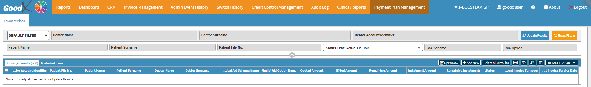 💡Please Note: For the Payment Plan Management tab to display, both the system setup and Episode Management must first be completed. For more information on Episode Management, please refer to the user manual: Debtors.
