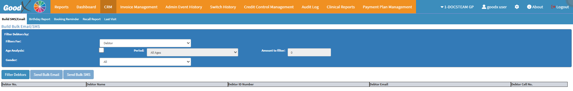 The CRM serves as a central communication tool that allows you to manage and maintain relationships with your Debtors and Patients. It enables the Practice to filter Debtors by various criteria, such as age, gender, and outstanding amounts, and then send personalised bulk SMSes or emails. This is essential for efficiently managing reminders, Follow-ups, Recalls, and other Patient engagement initiatives. A well-maintained CRM ensures improved communication, reduces missed appointments, supports faster payments, and ultimately enhances the overall Patient experience. By automating these outreach tasks, you save time, reduce manual errors, and strengthen your connection with the people you serve.