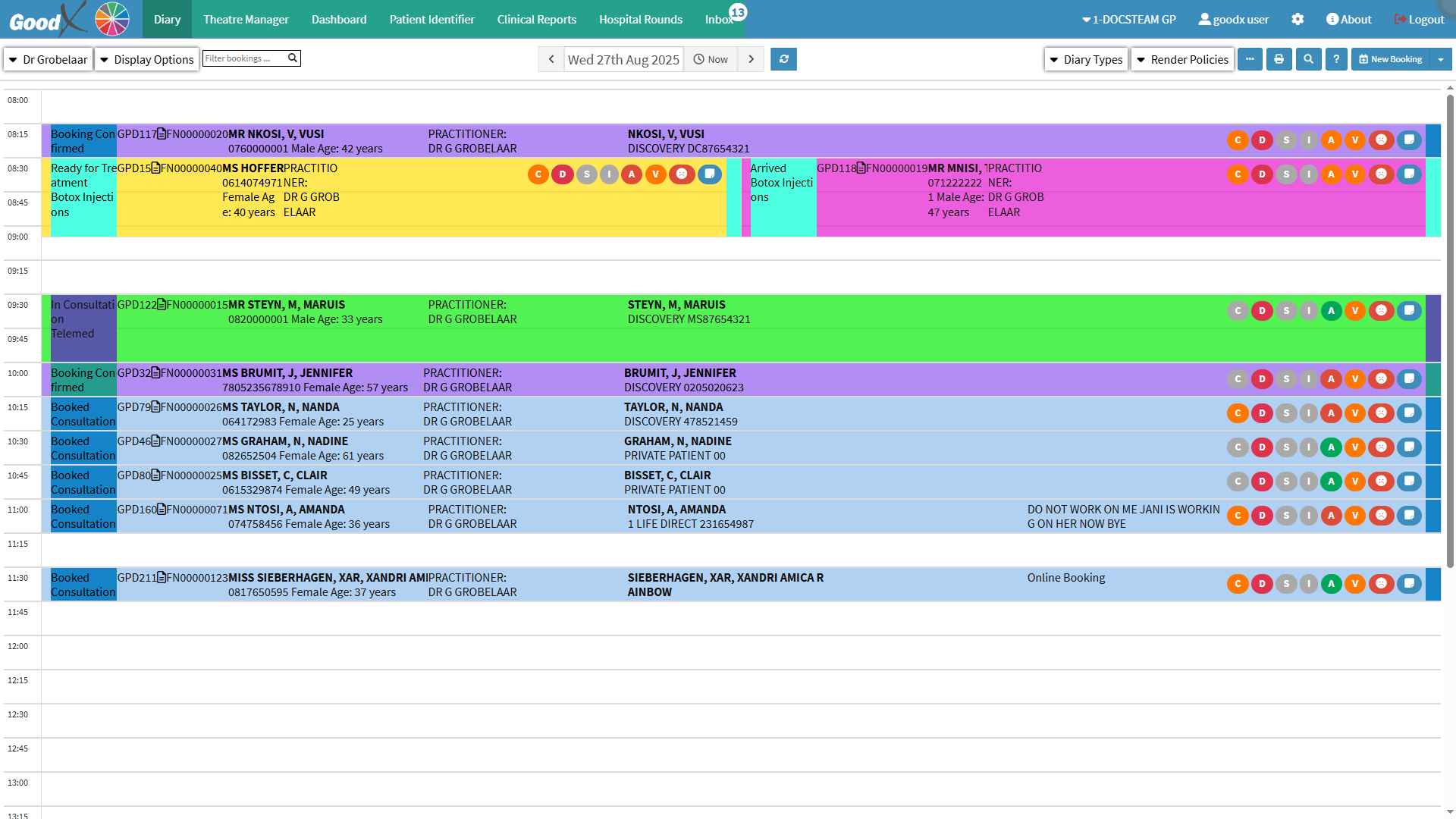 The Multi Diary View screen allows your Practice to display and manage multiple Practitioners’ diaries simultaneously, making coordination quicker and more efficient. Instead of working in separate diaries, you can view several side by side, easily move appointments between Practitioners when one is fully booked, or adjust schedules when cancellations occur. This flexibility helps prevent wasted time slots, ensures Patients are accommodated more smoothly, and supports better teamwork among staff. By providing a clear overview of daily operations, the Multi Diary View streamlines schedule organisation, improves time management, enhances Patient flow, and is especially beneficial in Practices where a single Receptionist manages several diaries.