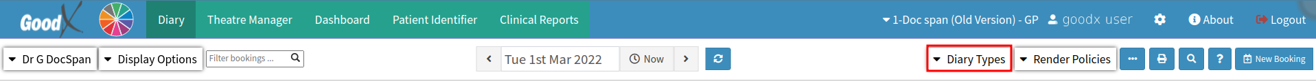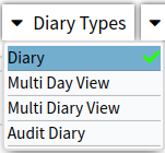 - Click on the Diary Types drop-down in the top right corner to access the different views of the Diary.
