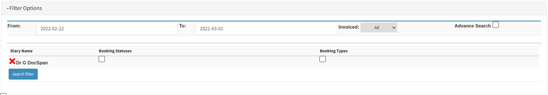 - All: The Diary will show all of the bookings regardless of their invoice status.