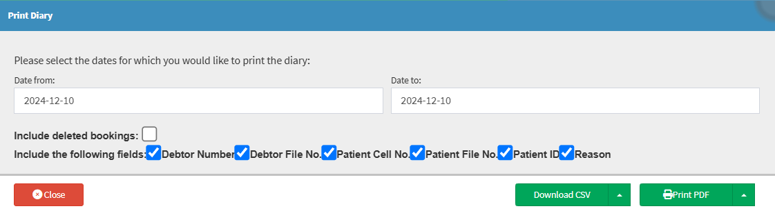 Additional filters are available, enabling you to choose what information will be included in the downloaded Diary printout.