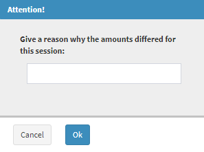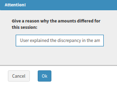 - If the amounts don't add up, an Attention screen will appear where the user must give a reason why the amounts differ.
