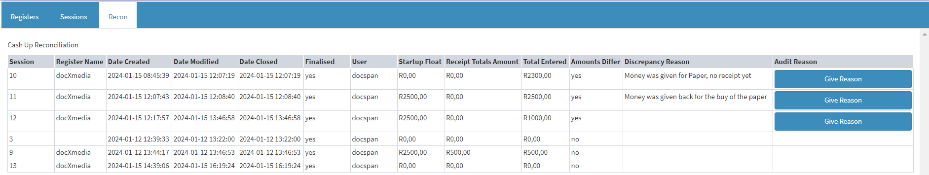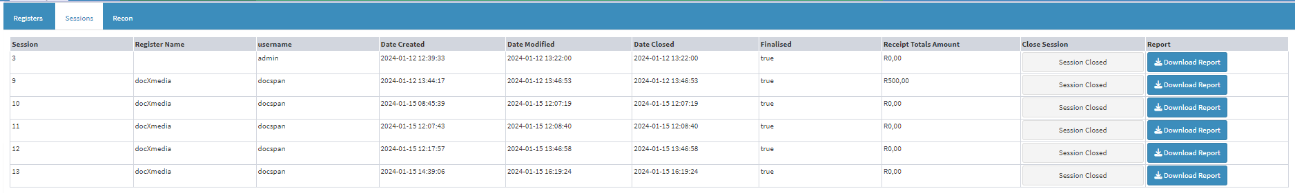 - All the Sessions on the Cash Register will be presented in a list.