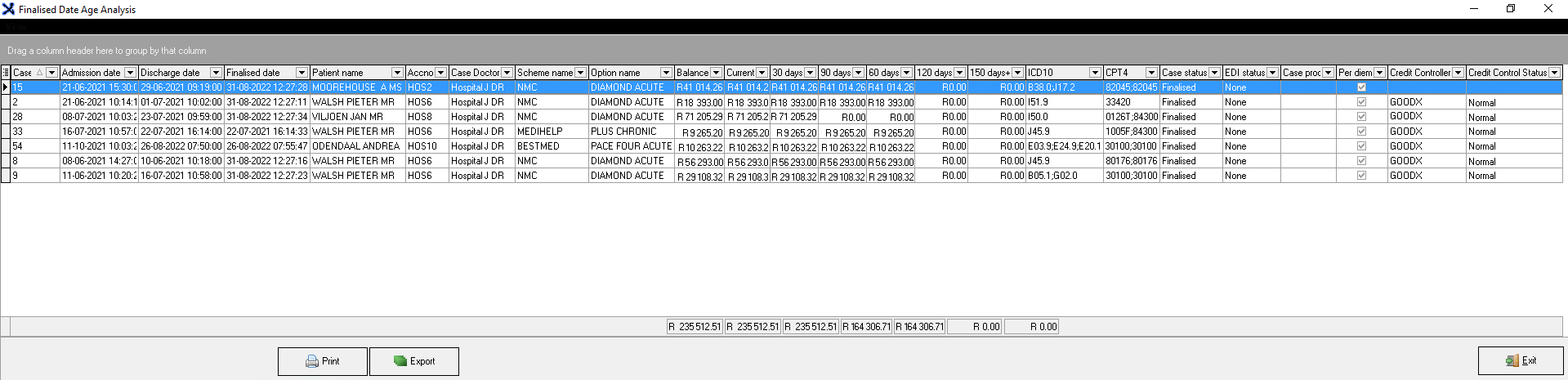 The Finalised Date Age Analysis is a report which indicates all the amounts that are still outstanding or have not been paid yet, after the Hospital Case has been finalised. The data that appears on the report will be determined by the Settings and Parameters that the user has set up and selected when the Report was set up. For example, data available on the report includes: Total and Current outstanding amounts for Patient and Medical Aid over different time periods such as 30, 60, and 90 days etc.