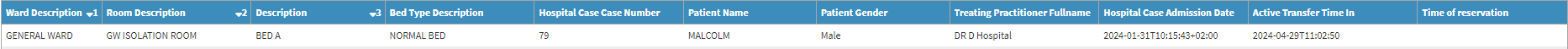 - Active Transfer Time In: The Date (yyyy-mm-dd) and Time (hh:mm) the Patient was transferred into the Bed.