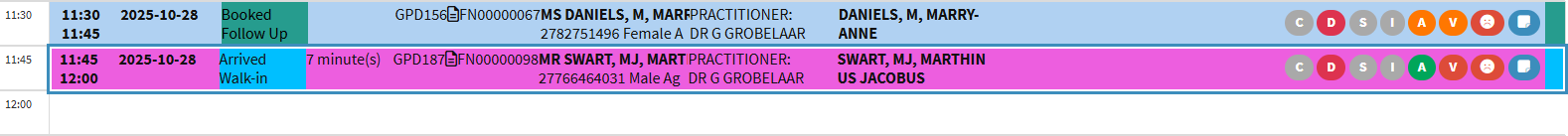When the booking is added to the Diary, the Patient is automatically marked as Arrived, as they are already at the Practice. This type of visit is typically handled quickly to allow the Practitioner to attend to the Patient promptly, and the booking type should be set up accordingly.