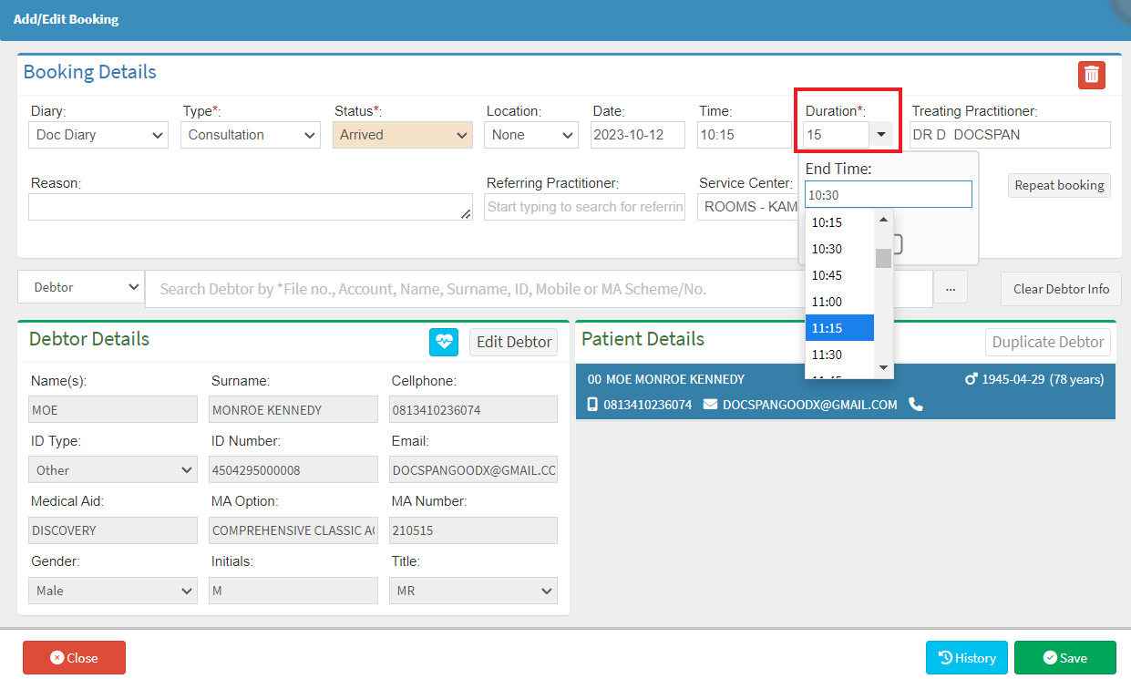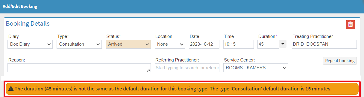 Please Note: After the duration was changed, the system will warn you that the duration exceeds the default duration for that specific Booking Type (Consultation - 15 minutes).