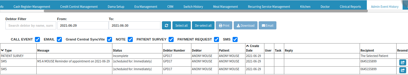 Once the booking has been made, all the Booking Event Templates that have been scheduled during the setup will go out automatically to the debtor/patient for who the booking was made, depending on the setup that was done.