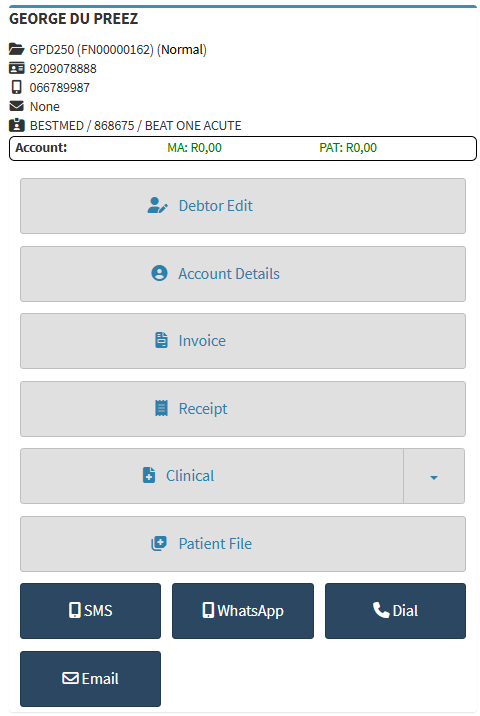 The Sidebar provides a quick-access overview and action panel for the selected Debtor and Patient. It consolidates key information such as contact details, account balances, and patient type, while also offering direct access to Debtor management, billing, clinical, and communication functions. This enables staff to work efficiently without navigating away from the main screen, ensuring accurate administration and seamless Patient interaction