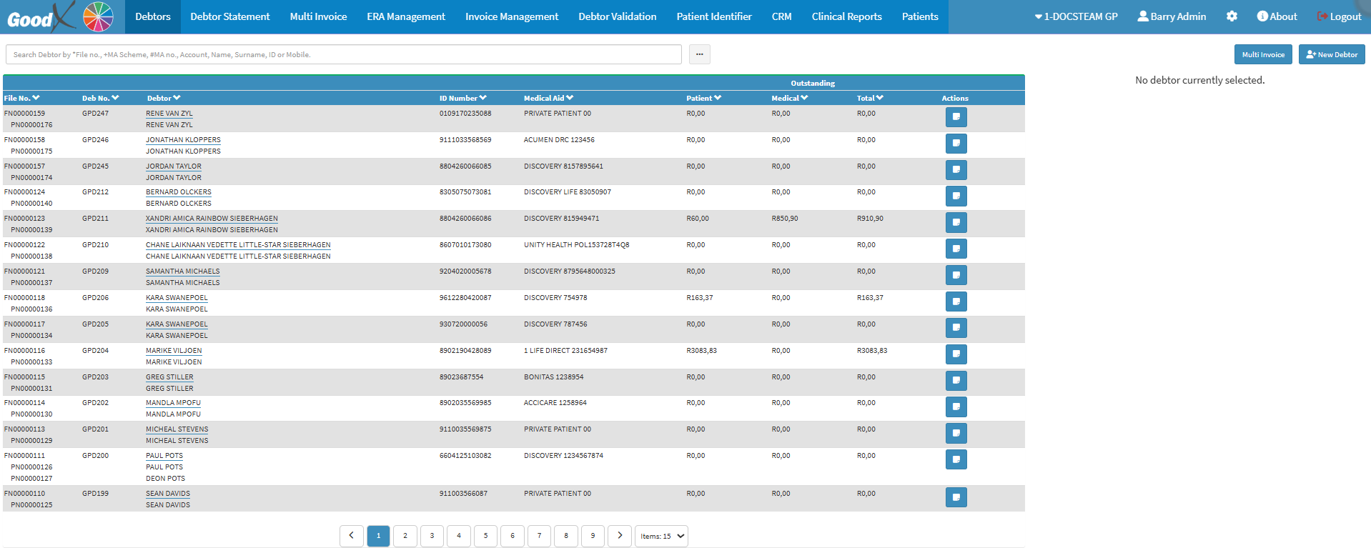 The Debtors screen provides a centralised view of all Debtors linked to the Practice, enabling staff to easily search for, review, and manage Debtor Information. It displays key details such as File Numbers, Debtor Names, ID Numbers, Medical Aid Information, and Outstanding Balances. This screen supports efficient Debtor Administration by allowing quick access to financial data, helping the Practice monitor amounts owed by Patients and Medical Aids, process payments, and maintain accurate records. By consolidating this information in one place, the Debtors screen improves cash flow management, reduces administrative effort, and ensures timely follow-up on outstanding accounts.