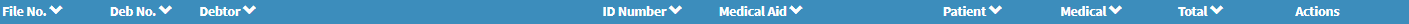 The columns on the Debtors screen are structured to provide the Practice with clear, concise access to essential Debtor information. Each column displays specific details, such as File Numbers, Debtor Names, ID Numbers, Medical Aid information, and Outstanding Balances, allowing Practice staff to identify and manage Patient accounts efficiently. This organised layout supports accurate billing, faster account lookups, and informed decision-making, ultimately contributing to smoother administrative and financial operations within the Practice