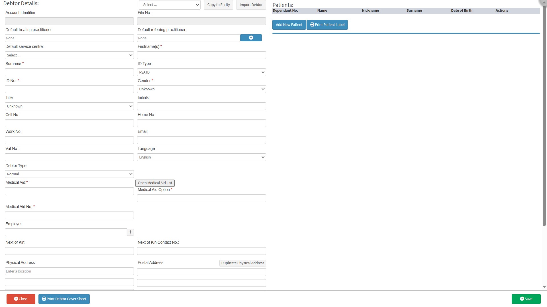 - Medical Aid: The name of the Medical Aid Scheme that the Debtor or Patient uses.