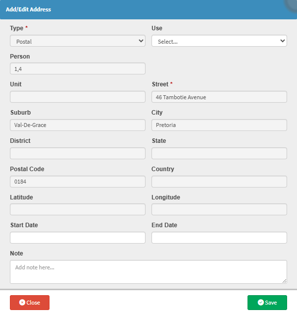 • Click on the Note field to enter any additional information relevant to this address.