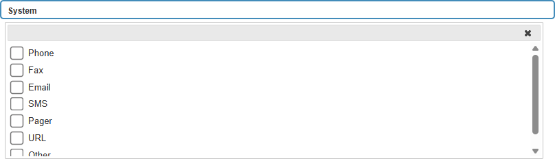- Click on the System field to select the method used for contact from the drop-down menu that becomes available.
