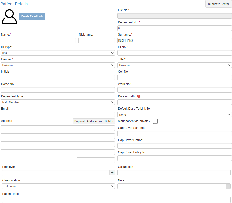 • Click on the Duplicate Debtor button to copy the details of the Debtor to the Patient fields, if the Patient is also the main member.