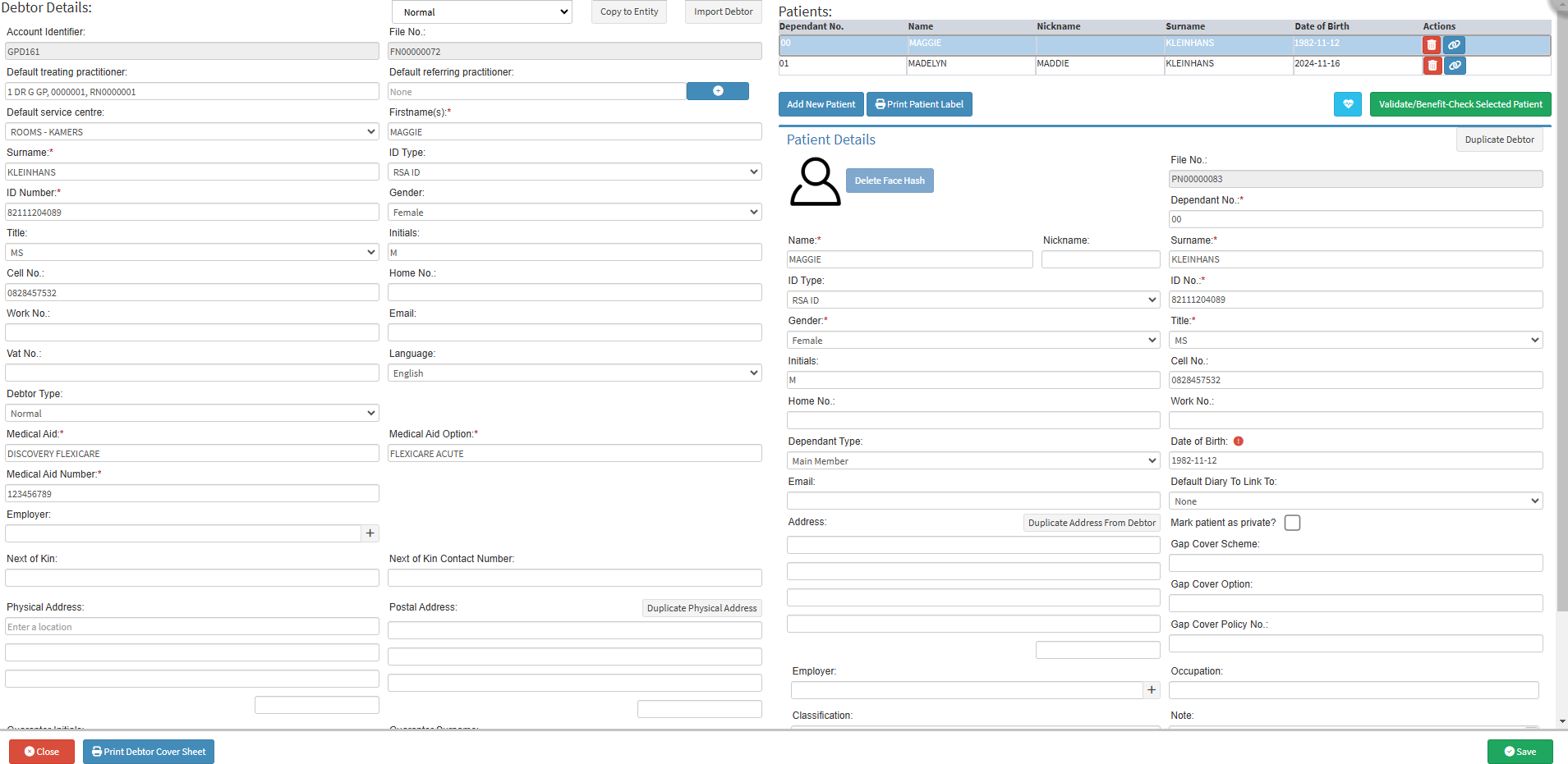 All Patients will need to be added as Dependants on a Debtor's file. The Debtor who is responsible for payment of the Account can add as many Dependants as necessary, for example, their wife/husband, child or grandparent. If the Debtor is a member of a Medical Aid, all added Dependants are automatically listed as Medical Aid Patients. If one or more of the Dependants are not listed on the Medical Aid card, they must be marked as a Private Dependant.
