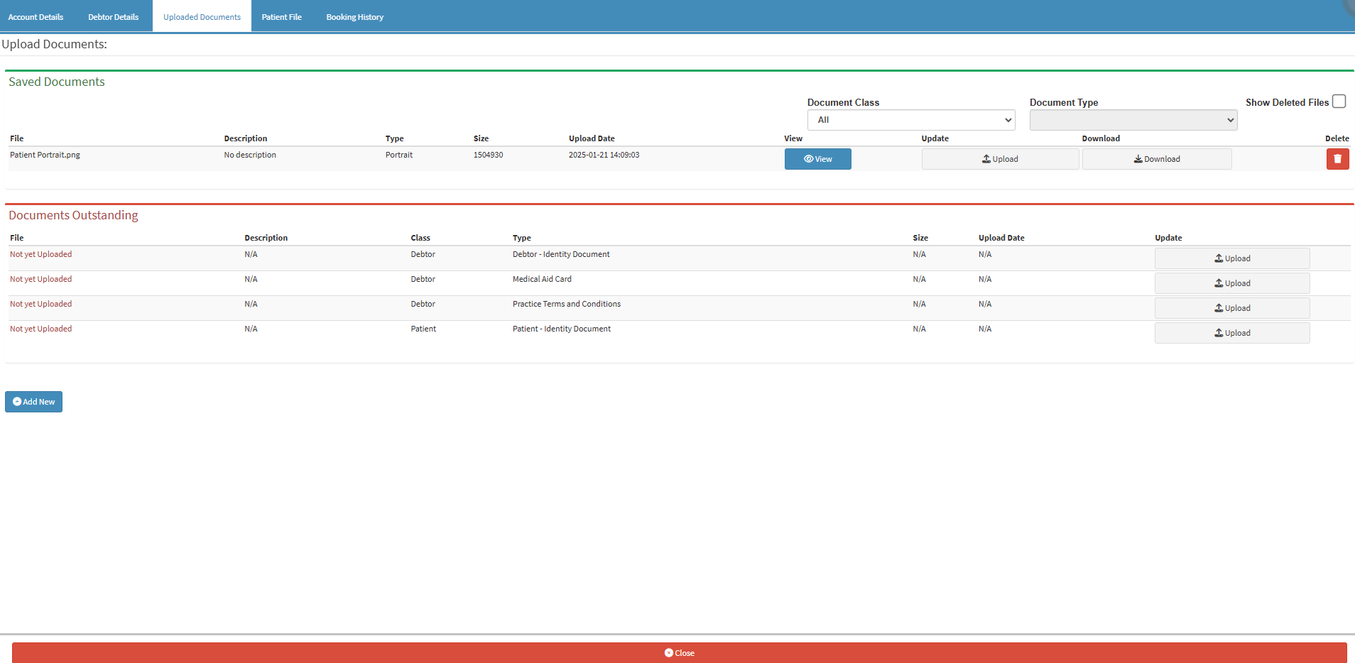 Uploading and Adding Debtor & Patient Documents is the process of digitally storing important records related to Debtors and Patients within the Practice’s system. This involves selecting and uploading files such as Medical Aid cards, Identification Documents, signed Terms and Conditions, and Consent forms to the corresponding Debtor or Patient profile. By doing so, the Practice ensures that all critical documentation is securely stored, easily accessible, and organised for efficient record-keeping and compliance with legal or administrative requirements.