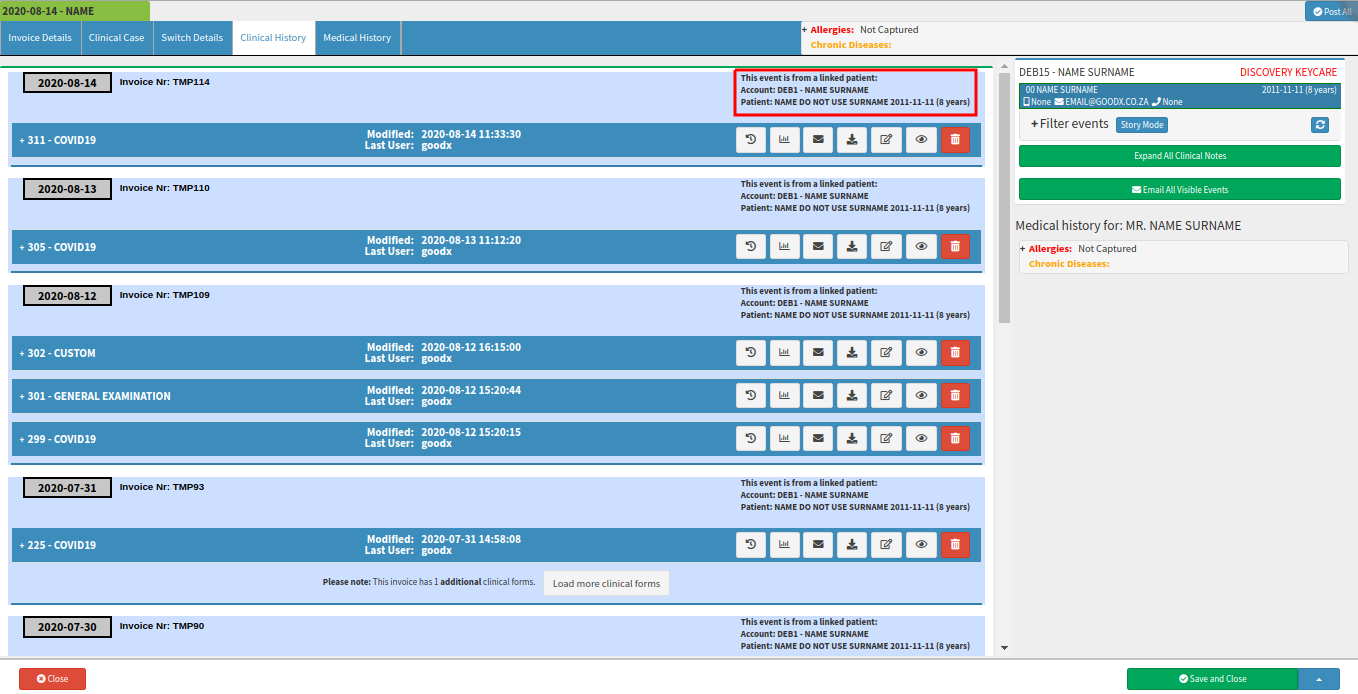 - The Clinical History screen will open. ALL the clinical data will be visible on this screen including the new copied clinical data from the other patient. Every event where the clinical data was copied will display a message: 'This event is from a linked patient' and it will also display the account from where it was copied from.